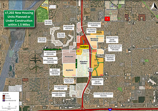 Located near major employment and entertainment drivers, the development is designed to serve one of the West Valley’s fastest-growing residential corridors while capturing significant regional freeway traffic. Located adjacent to Loop 101 and approximately two miles north of Interstate 10, the site benefits from exceptional visibility and accessibility. Traffic counts exceed 140,000 vehicles per day along Loop 101 and approximately 46,000 vehicles per day at the intersection of 99th Avenue and Indian School Road.