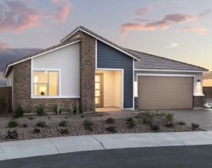 The community features a resort-style swimming pool and cabana with lounge seating, a shaded water playground, an event lawn and ramada with barbecue grills, sports courts, and an 11-acre community park, all set against scenic views of the nearby San Tan Mountains. Home offerings include six single-family floorplans ranging from 1,868 to 2,935 square feet with spacious backyards, three to five bedrooms and two to three baths, and two-, two-and-a-half-, and three-car garage options, with prices starting in the low $400s.