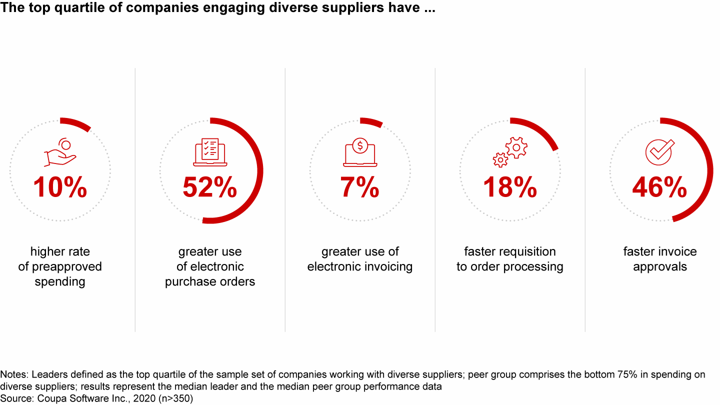 According to a 2021 Bain & Company report, having a diverse supply chain can improve your procurement processes overall. Companies that prioritize supply chain diversity have a 20% higher annual retention rate than those that don’t. They also have higher rates when it comes to pre-approved spending, electronic purchase orders and requisition to order processing times, as well as faster invoice approvals.