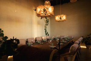 Design elements reinforce the sense of escape. Guests enter through a dramatic teak tree root installation from Indonesia encased in glass, surrounded by wine bottles from the menu. The space features bamboo accents, basket-woven pendant lighting from Indonesia, India, and Mexico, large tropical plants, and tables crafted from reclaimed tree roots. Earth tones, natural textures, and greenery evoke the feeling of a high-end resort in Tulum. Thoughtful touches include percheros to hang purses and dedicated spaces for returning guests to store unfinished bottles.