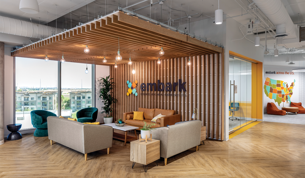 Embark Behavioral Health, a leading network of mental health treatment programs for youths and their families, recently moved its support office to a 24,000-square-foot office space in Chandler. The company hired interior architecture firm PHX Design One to implement the vision it had for the office: a colorful space that mimics the warm welcome Embark’s dozens of treatment programs provide families across the country.