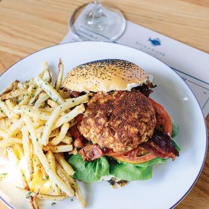 Interior design evokes old seafood canneries, while the patios — one enclosed by a split-rail fence, the other within a low stone wall — give a sense of rocky coast, with rough sandy floors and expanses of weathered wood. The front patio offers the full dining experience. The one in back serves more as cocktail lounge where guests can order drinks and small plates; Adirondack chairs are wisely designed with wide, flat arms that offer a convenient resting place for whatever refreshment was ordered.