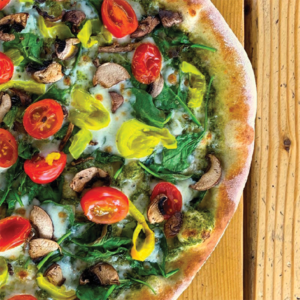 Garden Pesto Pizza [Freak Brothers]A pesto base topped with tangy banana peppers, spinach, grape tomatoes, mushrooms and mozzarella |